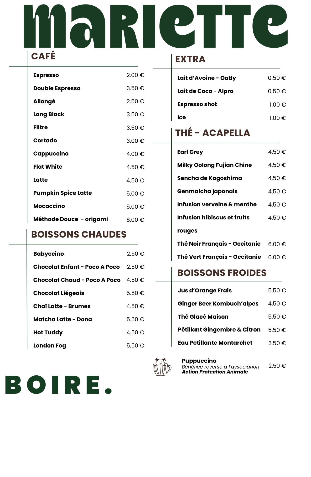 Ici, on prend le café au sérieux !… Mais toujours avec le sourire. Café de spécialité, thé bien sourcé, et toutes les boissons lactées qu’on aime, tout est pensé pour vous offrir le meilleur à chaque gorgée.