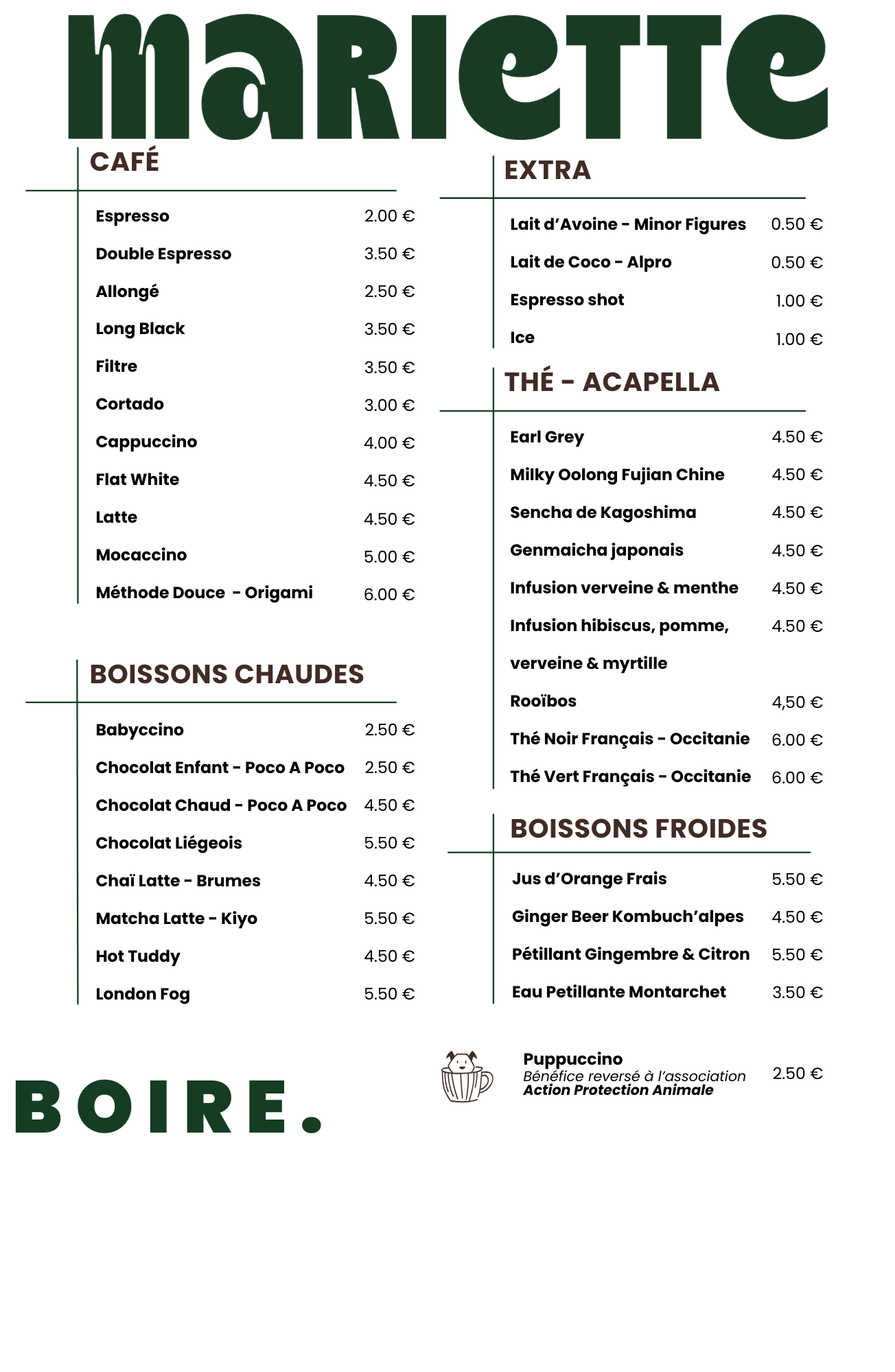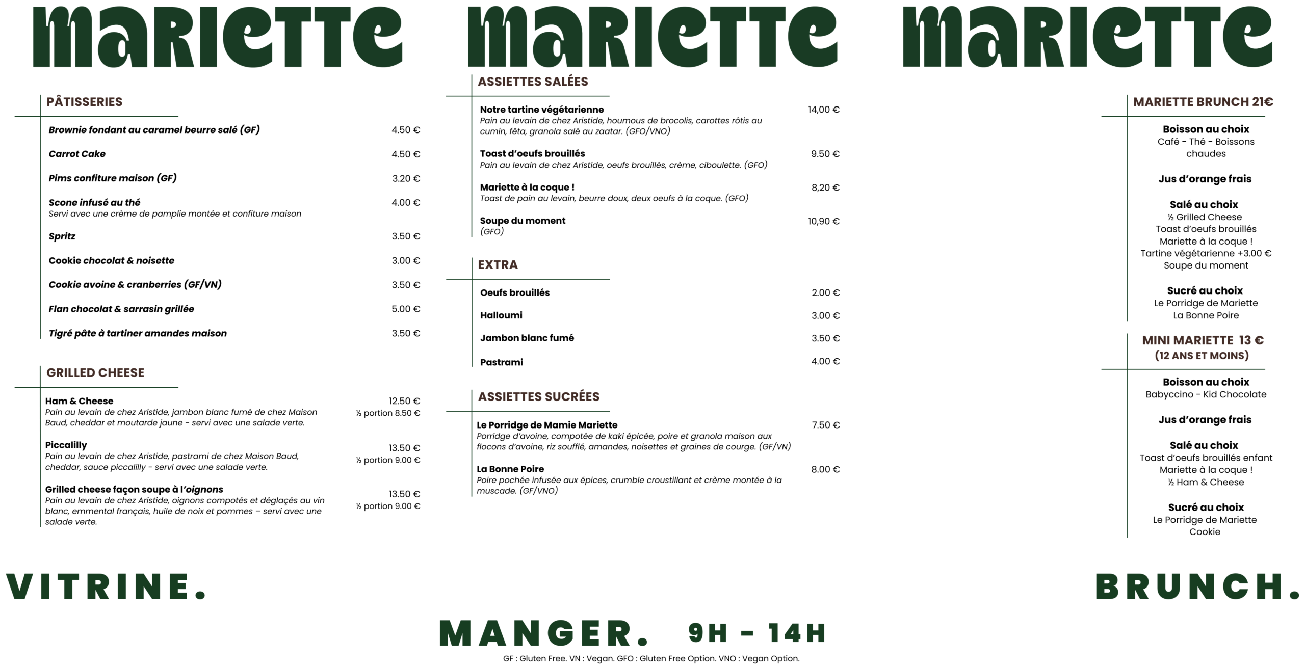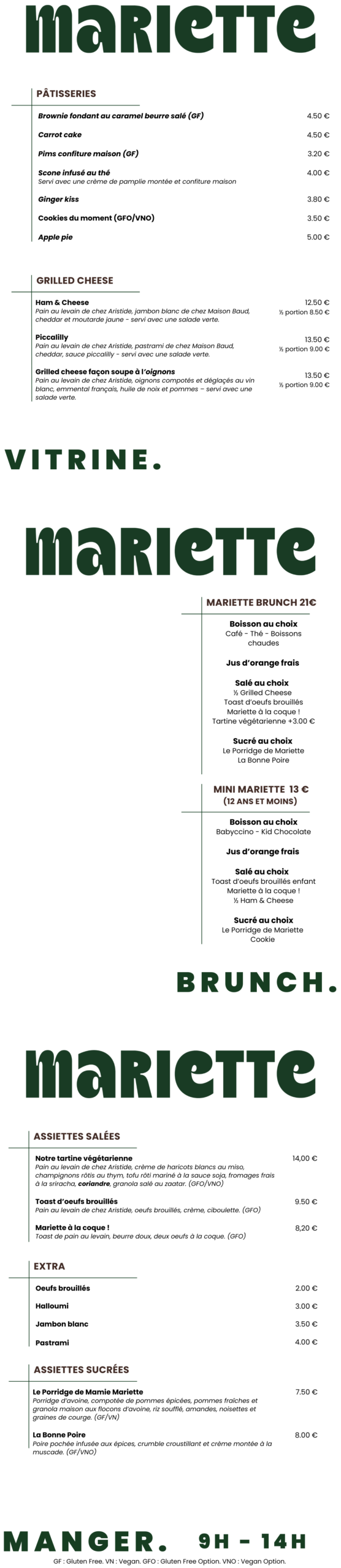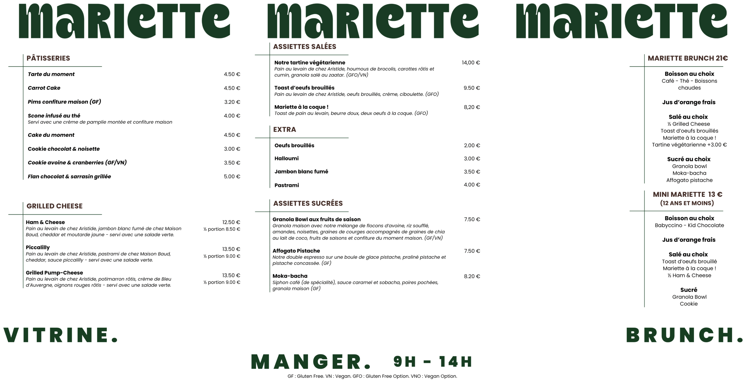 Chez Mariette, tout est fait maison ! On vous prépare des plats simples et savoureux. Et pour ceux qui n’aiment pas les règles, notre vitrine déborde de patisseries et de bons petits plats, prêts à être dévorés à toute heure !