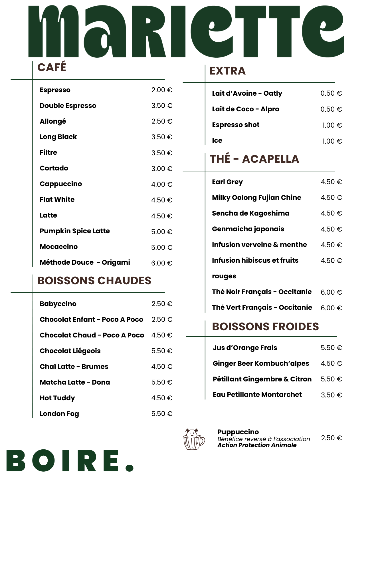 On s’est dit que ce serait chouette de pouvoir emporter un peu de Mariette chez vous. Alors on a installé un coin boutique : cafés du moment, thés, produits de nos fournisseurs… et tout ce qu’on aime avoir dans nos placards !